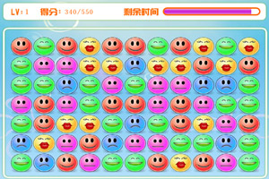 鼠标点击两个相邻的表情交换位置,使得3个及以上相同的表情图标连成一条线即可消去,否则无法交换位置。