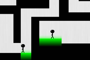 键盘方向键←→控制小黑人移动,↑键跳跃,到达目的地时按↓键过关(要两个小黑人同时站在绿色处)。