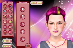 操作说明:鼠标左键点击进行操作。描述:暮光之城系列电影一上映,即受到全世界青少年的追捧。片中的女主角克莱斯汀.斯图尔特也成为当红偶像。你喜欢她以什么妆容出现在开幕式呢?