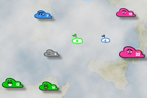 提示:释放云朵收集到星星,可使用云层周围的雷电图标加速云朵的攻击速度,雨滴图标增加点数的上限数量,太阳图标快速增加云层的点数。