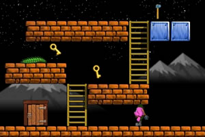 提示:按→/←键使用锤子敲碎砖块,按↓键使用铁锹挖掘砖块,按↑键使用梯子向上爬。