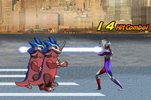 键盘方向键↑↓←→键控制奥特曼移动,V出脚,Z出拳,X斯比光线,C跳跃。