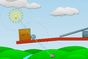 鼠标左键点击消除木块,引导通电器连接起来点亮灯泡,R键重玩。