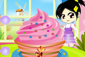 鼠标点击选择食材,再拖动食材制作纸杯蛋糕。点击选择奶油颜色,拖动奶油笔绘制图案。